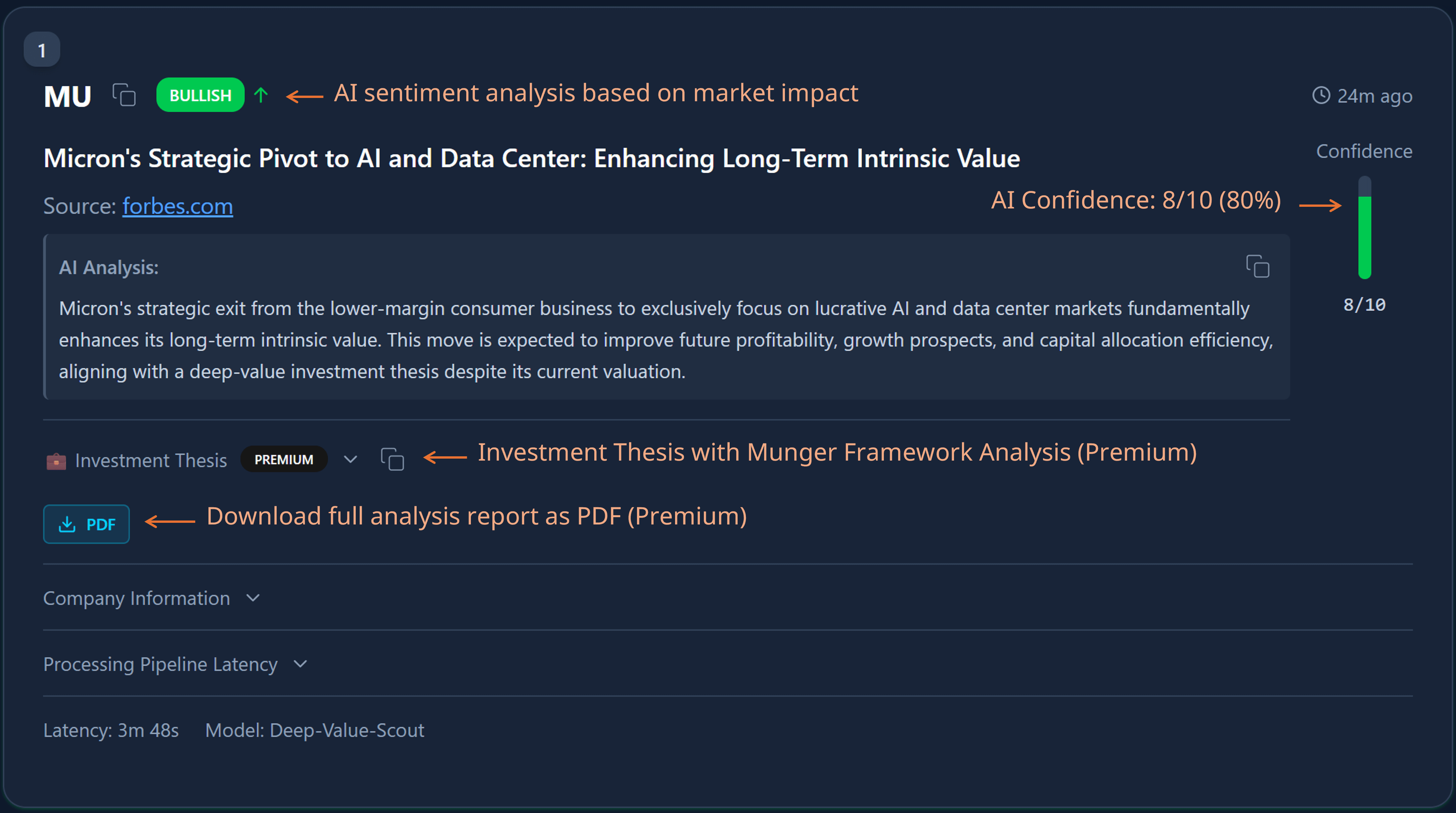 Every impactful press release gets analyzed in depth. Sentiment (BULLISH/BEARISH), confidence scoring, staleness detection, and priced-in checks—helping you quickly evaluate whether a PR deserves your attention and why. You stay in control; we provide the analysis.